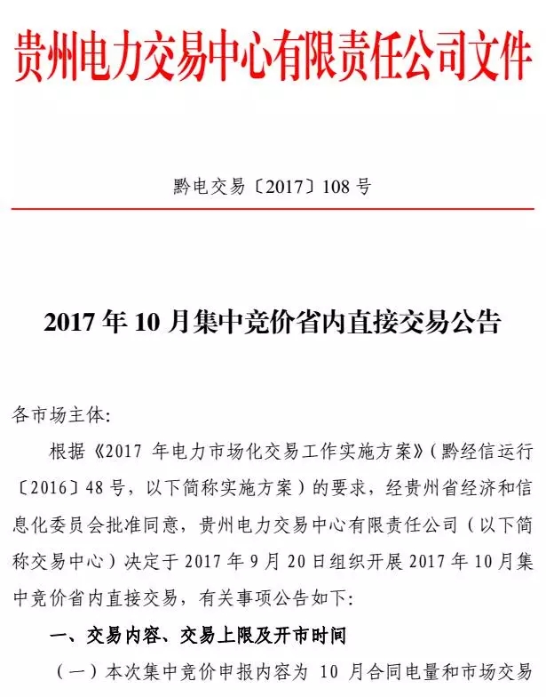 貴州2017年10月集中競價省內(nèi)直接交易公告