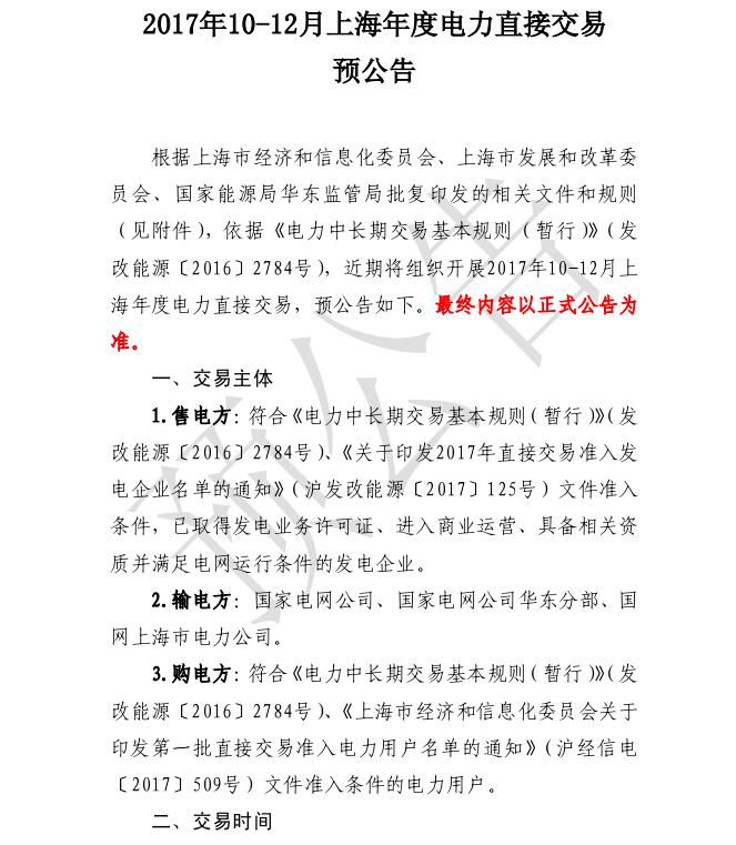 上海發(fā)布預公告:將開展2017年10-12月上海年度電力直接交易