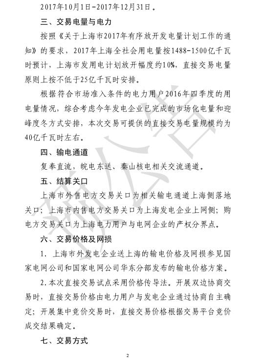 2017年9月19日,上海電力交易中心發(fā)布《2017年10-12月上海年度電力直接交易預公告》?!额A公告》中發(fā)布的交易時間為:2017年10月1日-2017年12月31日,交易電量為40億千瓦時。分別為雙邊協(xié)商交易和集中競價交易兩