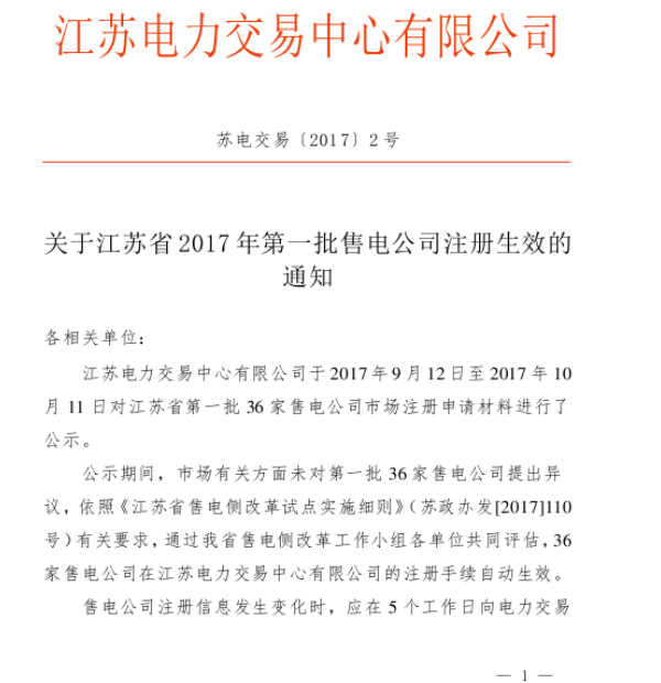 2017年10月12日,江蘇電力交易中心發(fā)布第一批售電公司注冊生效的通知。2017年9月12日-2017年10月11日,江蘇省對華能江蘇能源銷售有限責(zé)任公司、華能江蘇能源有限公司、國家電投集團(tuán)江蘇綜合能源供應(yīng)有限公司等第
