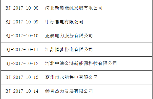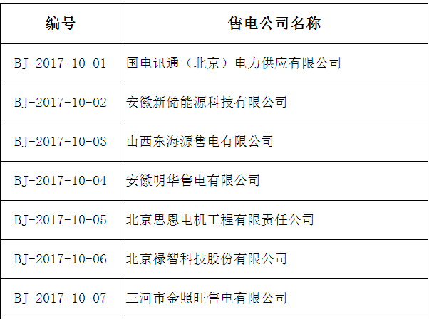 按照國(guó)家發(fā)改委、國(guó)家能源局《售電公司準(zhǔn)入與退出管理辦法》的要求,北京電力交易中心受理了下列售電公司的注冊(cè)申請(qǐng),對(duì)售電公司提交的市場(chǎng)準(zhǔn)入申請(qǐng)材料進(jìn)行了完整性核驗(yàn),現(xiàn)將企業(yè)名單及基本情況予以公示。