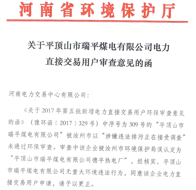 2018年1月8日省環(huán)保廳來(lái)函,2017年12月7日復(fù)函中關(guān)于“平頂山市瑞平煤電有限公司”的環(huán)保問(wèn)題認(rèn)定有誤,原則同意其參與電力直接交易。