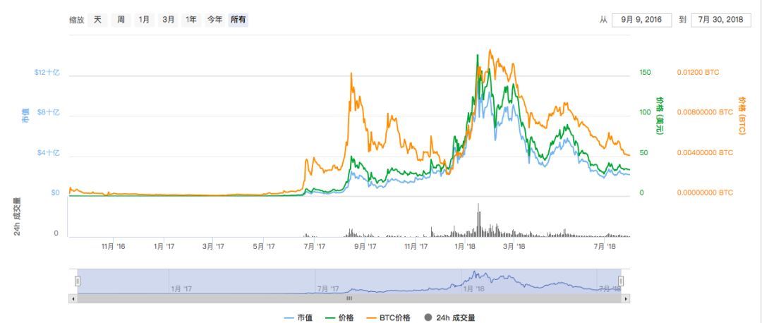 “94”是幣圈分水嶺,有些項(xiàng)目偃旗息鼓,也有的項(xiàng)目挺過(guò)來(lái)并迎來(lái)大牛市。在這個(gè)時(shí)間點(diǎn),量子鏈價(jià)格也一度從最高點(diǎn)的18美金,下跌至10美金左右,幾近腰斬。2017年年底,隨著牛市到來(lái),量子鏈價(jià)格瘋狂上漲,2018年1月,量子鏈價(jià)格上漲到歷史最高價(jià)86美金。然而,隨著2018年連續(xù)大半年的熊市,量子鏈價(jià)格一路陰跌至8美金左右。
