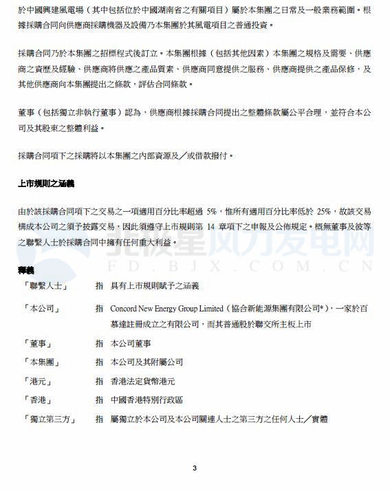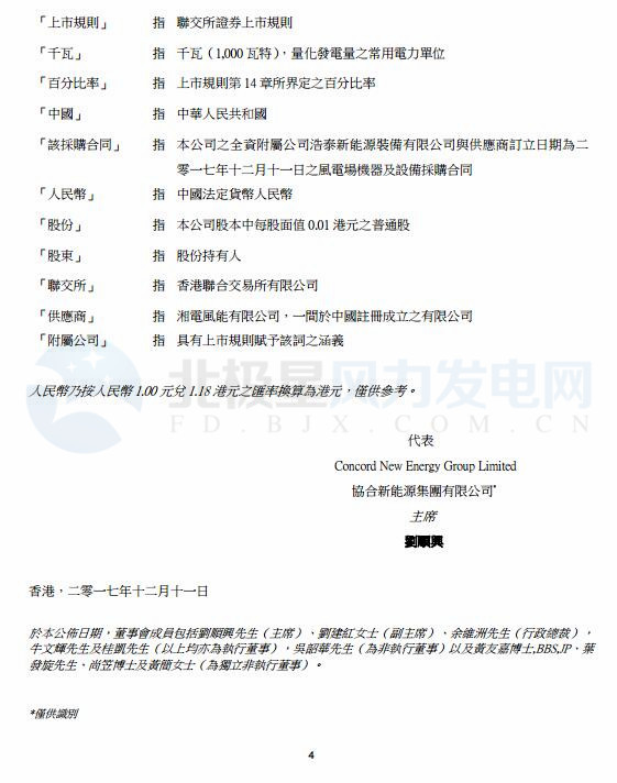 12月11日,協(xié)合新能源全資附屬公司浩泰新能源裝備有限公司與湘電風(fēng)能訂立合同,將采購其22組每組2200千瓦的風(fēng)力發(fā)電設(shè)施,總代價(jià)為1 84億元(183,920,000元),以供位于中國(guó)湖南省的風(fēng)電場(chǎng)項(xiàng)目使用。其中包括主機(jī)