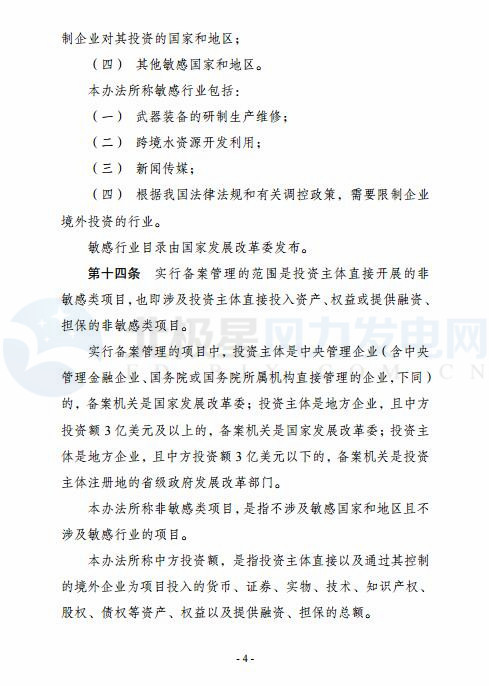 國家發(fā)改委昨日(12月26日)發(fā)布中華人民共和國國家發(fā)展和改革委員會(huì)令第11號(hào),公布《企業(yè)境外投資管理辦法》,對(duì)境外投資項(xiàng)目核準(zhǔn)和備案、境外投資監(jiān)管、法律責(zé)任等作出l了規(guī)定。以下為文件全文:中華人民共和國