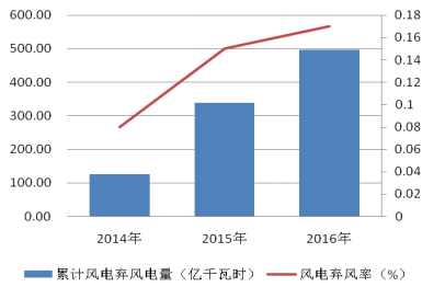 2014-2016年我國棄風電量及棄風率