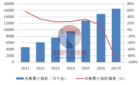 根據(jù)“十三五”末非化石能源比重提高至15%的目標,未來五年需年均新增風力發(fā)電量約600億千瓦時。預計2017年全國風力發(fā)電量將達到3060億千瓦時,同比增長近27%。