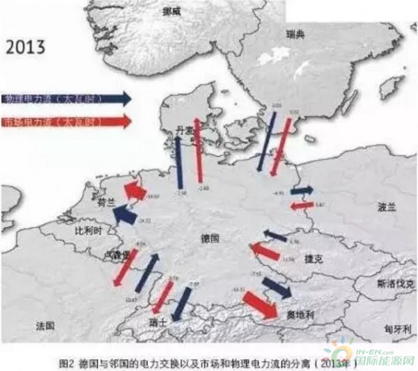 德國南北區(qū)域間存在著越來越嚴(yán)重的網(wǎng)絡(luò)阻塞,也存在多種互斥的解決方案。北部具有大量風(fēng)電,以及依靠進(jìn)口煤炭的煤電廠或者廉價(jià)褐煤電廠。相比而言,德國南部的天然氣、核電(因?yàn)镃O2 價(jià)格過低)與煤電(需要內(nèi)河運(yùn)輸成本)的成本就顯得高昂了。這種情況下,即使物理上南部并不缺少電力裝機(jī),但是在最小成本調(diào)度、整個(gè)德國是一個(gè)價(jià)格體系,傳輸容量限制的情況下,負(fù)荷與供應(yīng)地區(qū)不平衡的情況仍舊是存在的。因此,目前對鄰國,特別是波蘭、捷克等國網(wǎng)絡(luò)的借用來實(shí)現(xiàn)電力物理平衡的趨勢在增強(qiáng)(見圖2)。擴(kuò)大南北電網(wǎng)高壓傳輸容量(電網(wǎng)公司建議的400 千伏、800 千米線路),建設(shè)備用電廠,都可能成本高昂,并遭到了本地居民的強(qiáng)烈反對,短期內(nèi)完全不可能。而將定價(jià)區(qū)進(jìn)一步分割成為其他的備選方案。