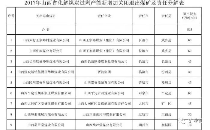 2017年5月9日,山西省首次發(fā)布2017年煤炭行業(yè)化解過剩產(chǎn)能關(guān)閉退出煤礦名單,包括同煤集團(tuán)等10家煤企旗下18座煤礦,退出產(chǎn)能為1740萬噸,如今加上此次新增525萬噸產(chǎn)能,山西省2017年退出產(chǎn)能將達(dá)到2265萬噸,居中國第1位。