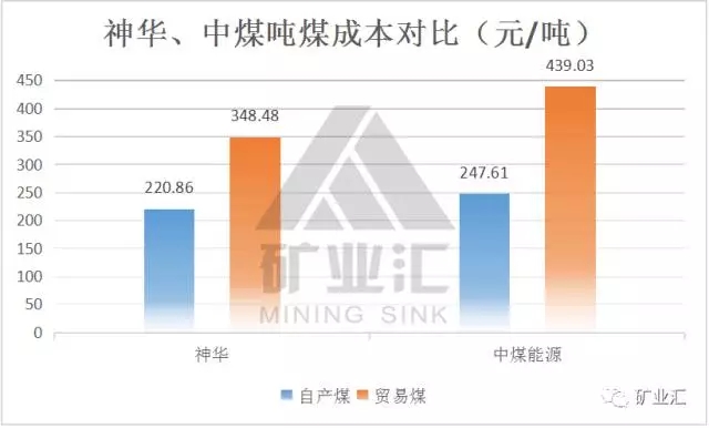 2015年,中國神華自產煤噸煤現(xiàn)金成本220.86元/噸,比中煤低26.76元/噸,而神華貿易煤噸煤現(xiàn)金成本348.48元/噸,比中煤低90.55元/噸。