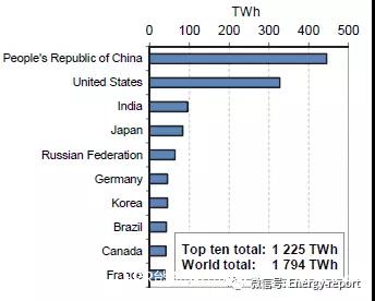 2016年,4個(gè)最大的非經(jīng)合組織電力用戶是中國(guó)、印度、俄羅斯聯(lián)邦和巴西,它們共同占據(jù)了非經(jīng)合組織電力消費(fèi)量(或全球36.1%消費(fèi))的66.3%。在這些國(guó)家中,中國(guó)的占比最高,占非經(jīng)合組織國(guó)家電力總消費(fèi)量的45.6%。經(jīng)合組織以外的電力使用主要由工業(yè)需求主導(dǎo),工業(yè)部門電力消費(fèi)占電力總消費(fèi)量的一半。