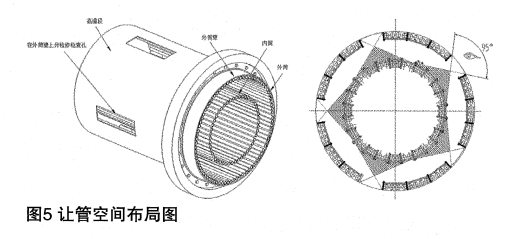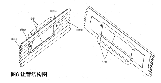 讓管主要是利用彎管將外管排向兩邊移開,同時(shí)在外簡(jiǎn)體高溫段開設(shè)長(zhǎng)方形檢修孔。外管排組由兩根回水管及兩根進(jìn)水管組成,將外管排兩組供水管二合一為一根供水讓管,兩組回水管二合一為一根回水讓管,讓管靠近簡(jiǎn)體外壁,形成一個(gè)檢查孔。并以相同的結(jié)構(gòu)在高溫段處開設(shè)5組檢查孔。在開孔后,整個(gè)視線空間能覆蓋內(nèi)筒外壁,0-2.5米長(zhǎng)度范圍的檢查視野達(dá)950,不存在檢修死區(qū)。