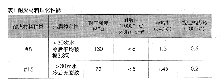 讓管位置管排采用讓管后,在冷渣機(jī)外筒內(nèi)部形成了兩組受熱區(qū)。為了保證受熱區(qū)內(nèi),外殼鋼板千燒無冷卻造成鋼板碳化變形,在受熱區(qū)內(nèi)填充耐火材料。耐火材料采用結(jié)構(gòu)如圖8,另外采用耐火材料澆筑可以保護(hù)雙筒冷渣機(jī)內(nèi)部支撐件的整體附陛。耐火材料理化性能如表1。