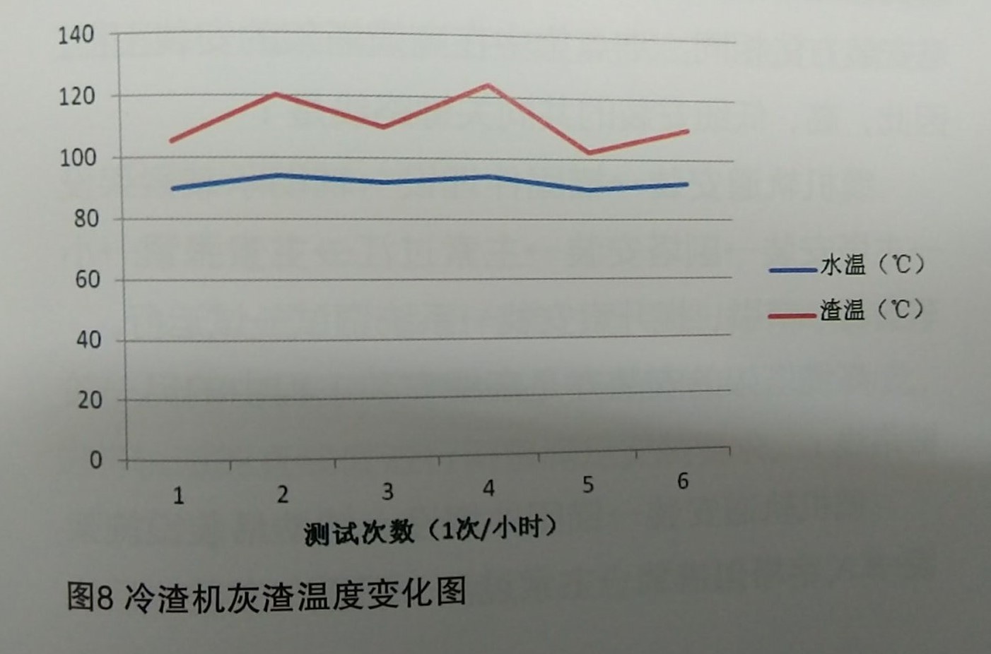 排渣溫度驗(yàn)證:在3r/min轉(zhuǎn)速下對(duì)回水溫度及出渣溫度進(jìn)行試驗(yàn)?;厮疁囟炔捎孟到y(tǒng)自帶DCS數(shù)據(jù),出渣溫度采用紅外線測(cè)溫儀取渣堆中部溫度,試驗(yàn)數(shù)據(jù)如圖8。