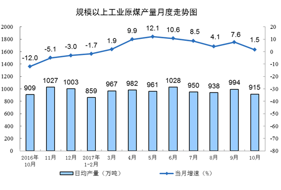 10月份,原煤產(chǎn)量2.8億噸,同比增長1.5%,增速比9月份回落6.1個百分點;日均生產(chǎn)914.7萬噸,比9月份減少79.1萬噸。1-10月份,原煤產(chǎn)量28.5億噸,同比增長4.8%。