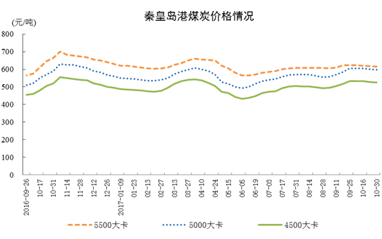 截至10月底,秦皇島5500大卡煤炭平倉價每噸616元,比9月底下降7元;5000大卡每噸598元,下降6元;4500大卡每噸526元,下降6元。