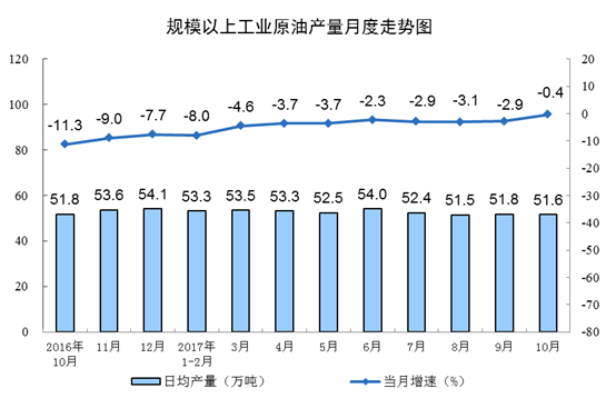 原油生產(chǎn)降幅收窄。10月份,原油產(chǎn)量同比下降0.4%,降幅比9月份收窄2.5個百分點;日均產(chǎn)量51.6萬噸,比9月份減少0.2萬噸。1-10月份,原油產(chǎn)量1.6億噸,同比下降4.1%。
