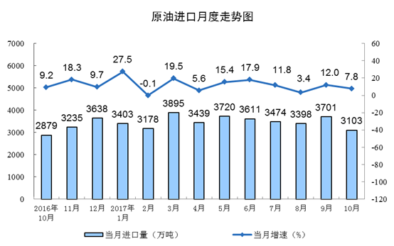原油進口增速回落。10月份,進口原油3103萬噸,同比增長7.8%,進口量比9月份減少598萬噸,增速比9月份回落4.2個百分點。1-10月份,進口原油3.5億噸,同比增長11.8%。