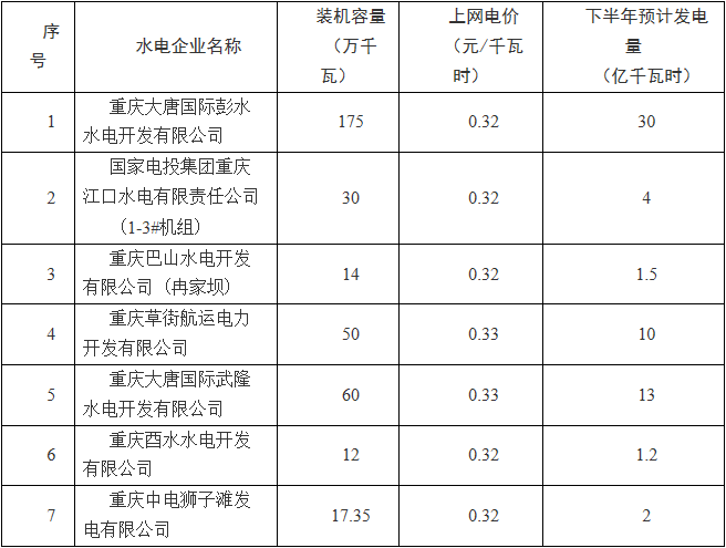 水電企業(yè)裝機容量、核定的上網(wǎng)電價及2017年下半年預計發(fā)電量