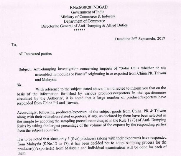 印度公布反傾銷調查中需要采樣的光伏企業(yè)名單(附原文件)
