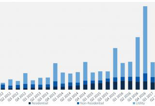 報(bào)告顯示,公共事業(yè)板塊中領(lǐng)先的是內(nèi)華達(dá)州、北卡羅來納州和德克薩斯州。其中,德克薩斯州2017年第三季度光伏裝機(jī)量比2015全年所有太陽能裝機(jī)量還多。美國(guó)東南地區(qū)光伏市場(chǎng)剛剛起步,佛羅里達(dá)州、密西西比州、南卡羅來納州都實(shí)現(xiàn)強(qiáng)勁增長(zhǎng),且預(yù)期2017年光伏裝機(jī)量將高于此前多有年份。根據(jù)SEIA,當(dāng)前全美處于建設(shè)當(dāng)中的公共事業(yè)規(guī)模光伏項(xiàng)目有4GW,GTM Research預(yù)測(cè)到年末還將增加3.9 GW。這樣一來,2017年將成為美國(guó)光伏裝機(jī)量第二大的年份,僅次于2016年。