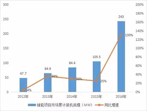 根據(jù)相關(guān)統(tǒng)計(jì)數(shù)據(jù),截至2016年底,我國(guó)儲(chǔ)能項(xiàng)目市場(chǎng)(不含抽水蓄能、壓縮空氣及儲(chǔ)熱)累計(jì)裝機(jī)規(guī)模243MW;2017年更是儲(chǔ)能產(chǎn)業(yè)飛速發(fā)展的一年,從2016年到2017月底,我國(guó)新增在建和投運(yùn)的電化學(xué)儲(chǔ)能裝機(jī)規(guī)模達(dá)到1.35GW。