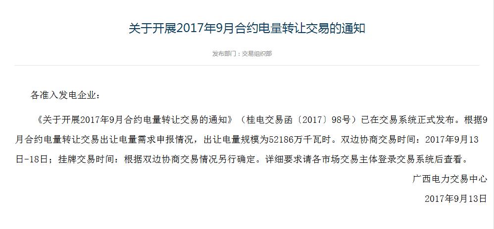 2017年9月18日,廣西電力交易中心發(fā)布2017年9月合約電量轉(zhuǎn)讓掛牌交易時(shí)間的通知?!锻ㄖ分蟹Q,根據(jù)2017年9月合約電量轉(zhuǎn)讓雙邊協(xié)商交易結(jié)果,剩余電量定于2017年9月20日9:00至11:00以掛牌交易的方式開展。交易規(guī)模為52186萬(wàn)千瓦時(shí)。