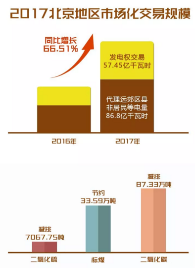 2017年,北京地區(qū)全年完成市場化交易電量144.25億千瓦時,同比增長66.51%,其中,發(fā)電權(quán)交易電量57.45億千瓦時,節(jié)約標(biāo)煤33.59萬噸、減排二氧化硫7067.75噸,減排二氧化碳87.33萬噸;代理遠(yuǎn)郊區(qū)縣非居民等其他市場化交易電量86.8億千瓦時。