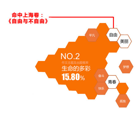 以上海市為例,2014年上海卷高考作文題為“自由與不自由”,在百度大數(shù)據(jù)預測的出題概率第二大作文主題“生命的多彩”中,恰好命中作文關(guān)鍵詞“自由”。