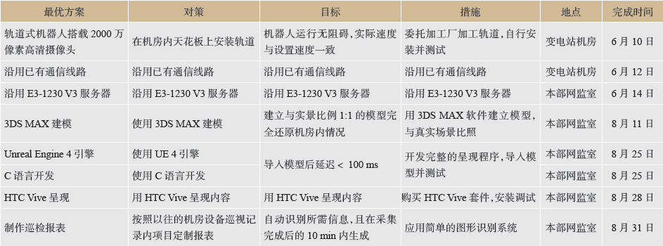 根據(jù)以往的機(jī)房設(shè)備巡視記錄表,需要巡視的內(nèi)容都是標(biāo)準(zhǔn)數(shù)字的示數(shù)、紅黃綠燈等可簡(jiǎn)單圖像識(shí)別的數(shù)據(jù),使用簡(jiǎn)單的圖像處理系統(tǒng)識(shí)別之后,系統(tǒng)可以自行制作電子數(shù)據(jù)報(bào)表并存檔。根據(jù)確定的最佳方案,制訂了詳細(xì)的方案實(shí)施對(duì)策表(見(jiàn)表2)。