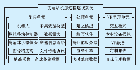 表1對(duì)比可知,全景模式雖然在獲取數(shù)據(jù)速度上比VR模式稍有優(yōu)勢(shì),但領(lǐng)先幅度不大,且在至關(guān)重要的準(zhǔn)確度上有一定劣勢(shì)。因此本文采用VR方式作為本系統(tǒng)的呈現(xiàn)方案,并設(shè)計(jì)巡視系統(tǒng)方案架構(gòu)(見(jiàn)圖1),主要由采集單元、處理單元、VR呈現(xiàn)單元等模塊組成[11]