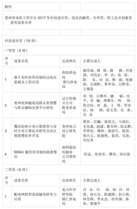 近日,貴州省電機(jī)工程學(xué)會(huì)公布《關(guān)于公布2017年度貴州省電力科技獎(jiǎng)的通知》,通知中稱,根據(jù)專業(yè)組初評(píng)意見,2017年11月21日,科技獎(jiǎng)勵(lì)辦法評(píng)審專家委員會(huì)對(duì)專業(yè)組推薦成果進(jìn)行審查和表決,同意對(duì)“基于實(shí)時(shí)波形壓縮的過電壓監(jiān)測(cè)及工程應(yīng)用”“貴州電網(wǎng)輸電線路災(zāi)害預(yù)警與防災(zāi)輔助決策平臺(tái)研究”等18項(xiàng)科技進(jìn)步成果、“貴州電網(wǎng)220kV主變保護(hù)裝置升級(jí)改造及定值策略優(yōu)化研究及應(yīng)用”“貴州電網(wǎng)輸電線路地質(zhì)隱患勘察與防治決策系統(tǒng)開發(fā)及工程應(yīng)用”等14項(xiàng)技改貢獻(xiàn)成果、“基于防護(hù)光纜布線裝置研究與應(yīng)用”“35千伏電壓互感器熔斷器安裝座的研制”等11項(xiàng)職工技術(shù)創(chuàng)新成果進(jìn)行公布并予以表彰。